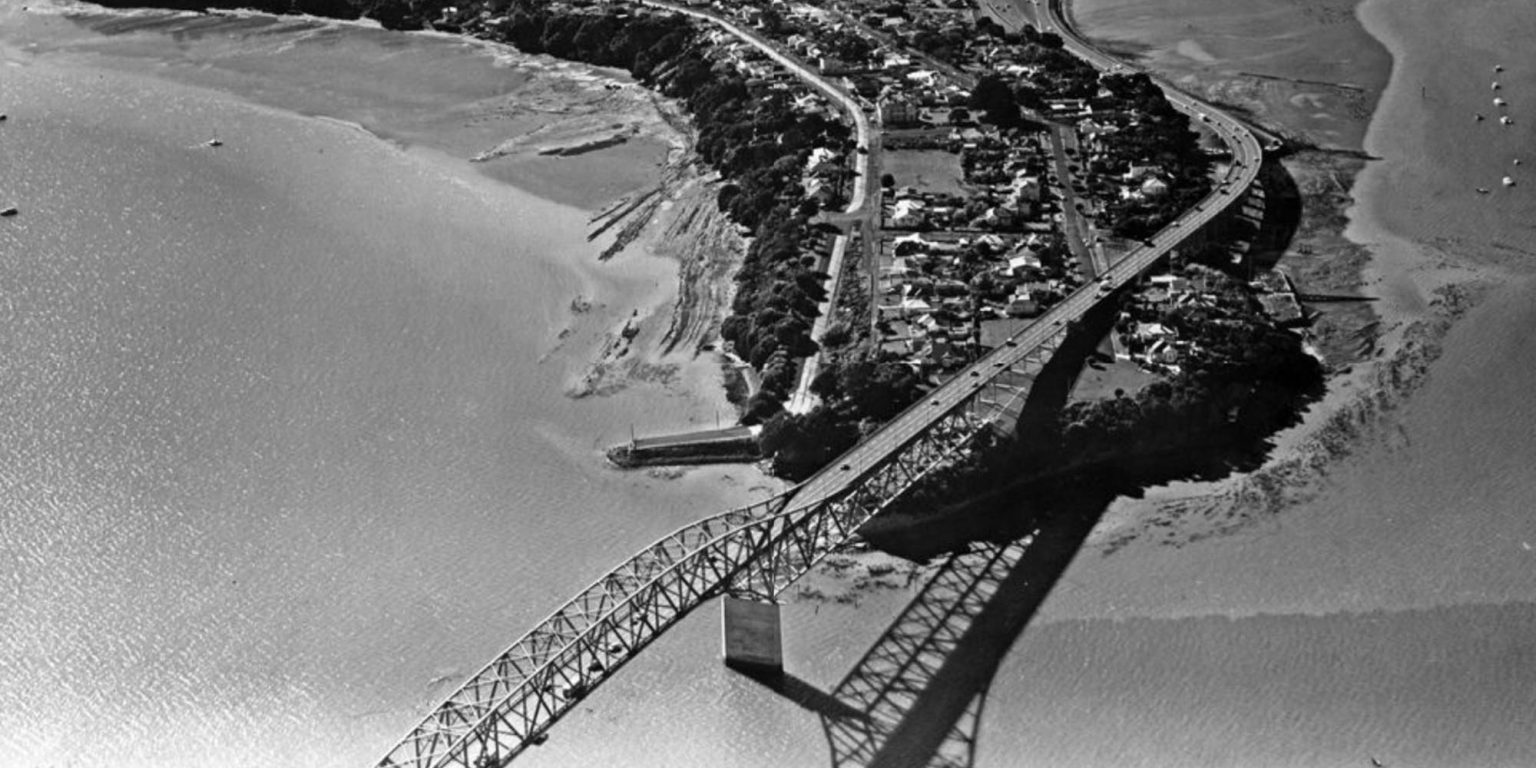 Aerial view of the Auckland Harbour Bridge, 1960s, aerial photograph by Whites Aviation, reproduced with permission Auckland Libraries Heritage Collections N0113212;